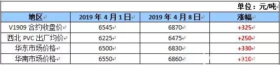 沉寂3個(gè)月的PVC,踏入4月后表現(xiàn)可謂突飛猛進(jìn)。尤其在PVC期貨實(shí)現(xiàn)移倉(cāng)換月后,漲價(jià)動(dòng)能得到充分激發(fā),大舉突破震蕩狀態(tài),從4月1日至4月8日,大商所V1909合約收盤(pán)價(jià)漲幅近5.0%。而PVC生產(chǎn)廠(chǎng)家在庫(kù)存低位的情況下看漲情緒較強(qiáng),助推漲價(jià)潮在短時(shí)間內(nèi)愈演愈烈。