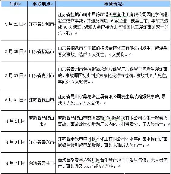 “3·21”特別重大爆炸事故發(fā)生以后,安全事故并沒(méi)有由此停歇,并再度頻繁上演。接連的爆炸事件引起政府和群眾的高度重視,事故發(fā)生后全國(guó)在化工領(lǐng)域開(kāi)展危化品密集式排查,化工行業(yè)整治力度再上臺(tái)階。作為本輪事故多發(fā)地的江蘇省,亦于4月1日出臺(tái)史上最嚴(yán)的整治方案:要求到2020年底,江蘇省化工生產(chǎn)企業(yè)數(shù)量減少到2000家,到2022年,全省化工生產(chǎn)企業(yè)數(shù)量不超過(guò)1000家。4月5日,江蘇鹽城決定徹底關(guān)閉響水化工園區(qū),鹽城這一舉措,外界認(rèn)為無(wú)疑于是“壯士斷腕”。