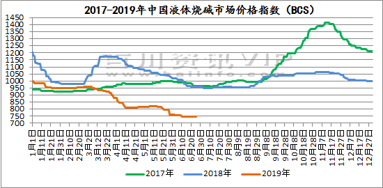 2019年中國液體燒堿整體走勢下行明顯,價格下滑至近三年來市場最低水平,下游需求整體較為疲軟,是今年國內燒堿市場下行的主要原因。根據百川資訊跟蹤數據,6月份國內32%離子膜液堿市場平均價格在751元/噸,與1月份的平均水平966元/噸相比,降幅在22.26%;根據百川資訊跟蹤數據,6月份國內50%離子膜液堿市場平均價格在1300元/噸,與1月份的平均水平1607元/噸相比,降幅在19.10%。