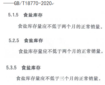 GB/T18770-2020標(biāo)準(zhǔn)提出A、AA級企業(yè)“應(yīng)不低于”二個月正常銷量儲備,AAA級企業(yè)“應(yīng)不低于”三個月正常銷量儲備,井礦鹽區(qū)生產(chǎn)精制鹽按市場需要產(chǎn)出,不象海湖鹽區(qū)產(chǎn)場集中生產(chǎn)堆垛,在目前市場競爭條件下難以實現(xiàn),能夠達到一個月正常銷量食鹽儲備都很不錯了。