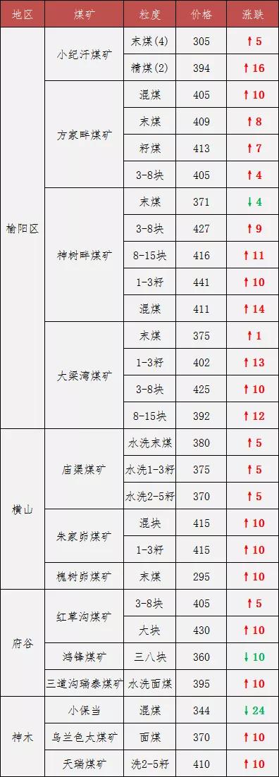 據榆林煤炭交易中心數據顯示,現在榆陽區(6000K 0.6S)標準煤均價已漲至399元/噸,神木(5800K 0.4S)標準煤均價漲至385元/噸,府谷(5500K 0.4S)標準煤均價漲至355元/噸。