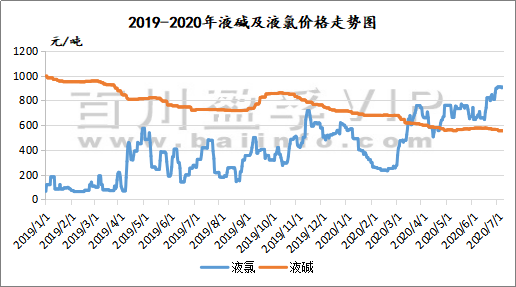 今年氯堿綜合利潤不高,燒堿盈利微薄,且局部地區(qū)始終倒掛,“以氯補堿”的情況比較明顯。我們將主產(chǎn)區(qū)山東、江蘇槽車出貨價格進行分析發(fā)現(xiàn):2020年山東地區(qū)液氯價格保持在500-800元/噸調整,500元/噸基本為山東液氯托底價格。2020年1-6月份山東地區(qū)液氯槽車出貨均價為487.09元/噸,同比2019年山東地區(qū)液氯槽車出貨均價82.3元/噸上漲491.84%。而江蘇地區(qū)液氯出貨價格在350-800元/噸之間調整,350元/噸基本為江蘇液氯托底價格。2020年1-6月份江蘇地區(qū)液氯槽車出貨均價為603.3元/噸同比2019年江蘇地區(qū)液氯槽車出貨均價229.4元/噸上漲162.99%。