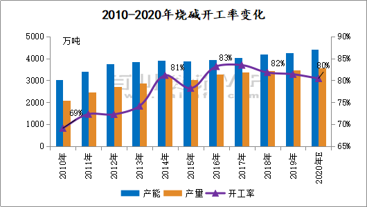 2020年6月末百川盈孚統計中國燒堿產能約4341.4萬噸,燒堿產能利用率逐漸穩定在80%上方。