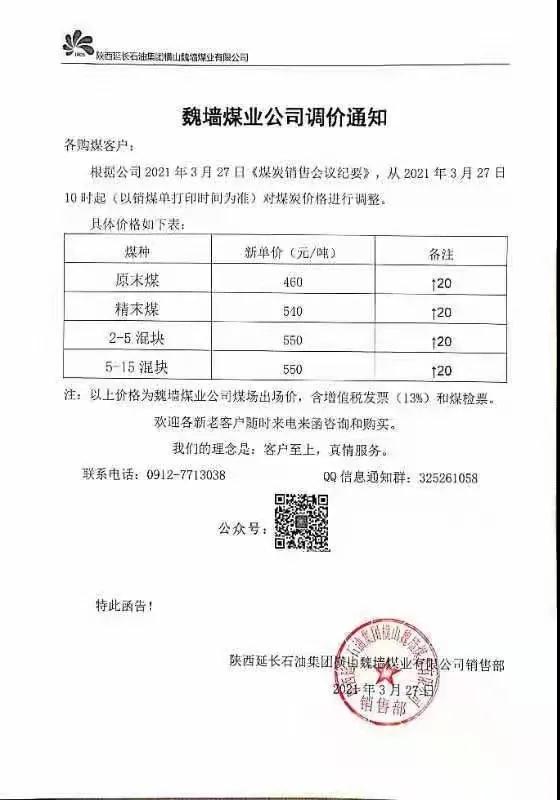 朱家峁煤礦(3月27日)14時對末煤、一三籽、混塊價格各上調20元/噸,以下磅時間為準!請各客戶及時合理安排發運!