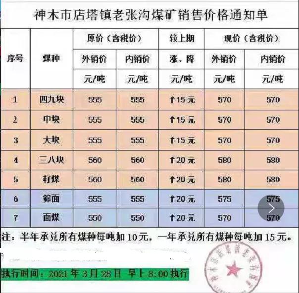 2021年3月26日18:00起,千樹塔煤礦執行面煤530元/噸,3-8塊580元/噸,8-15塊570元/噸。