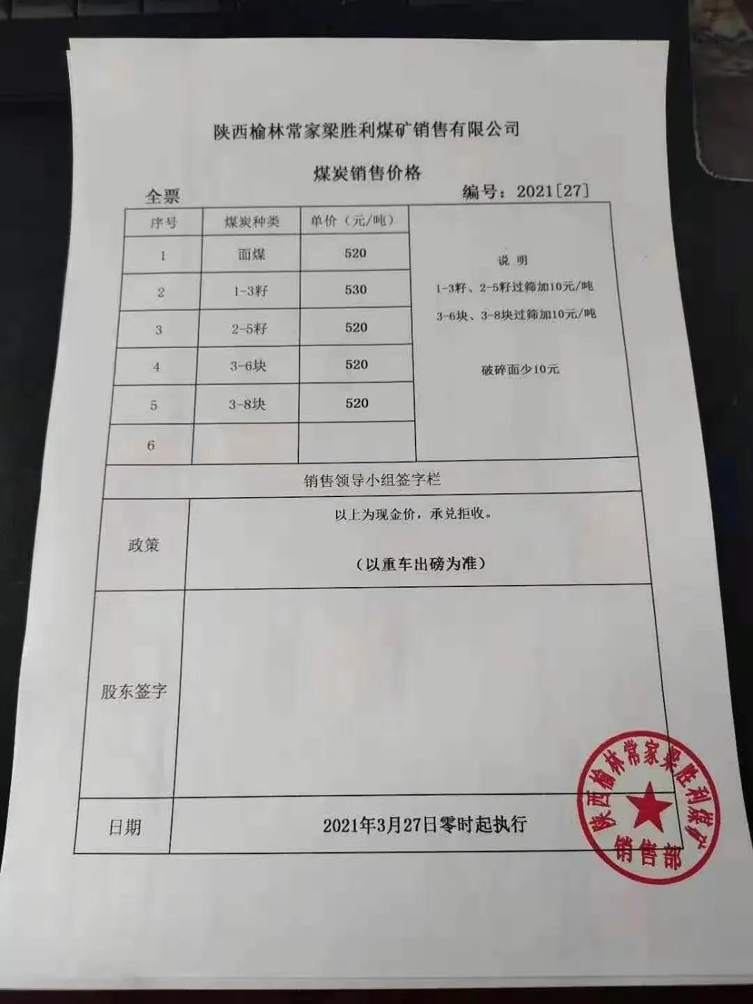 中聯礦2021年3月28號早上6點價格調整為:4300大卡原煤285元,5700大卡洗面煤510元,洗一三籽500元,洗二五籽500元,洗三六籽500元,洗三八塊500元,洗四九塊500元。