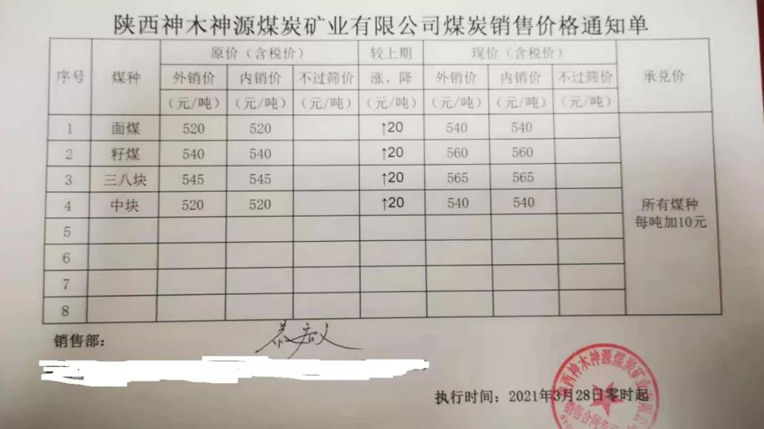 府谷縣老高川鄉恒益煤礦3月27日上午10:00:00時起,面煤、次精煤、二五籽、四九塊各漲價10元/噸。