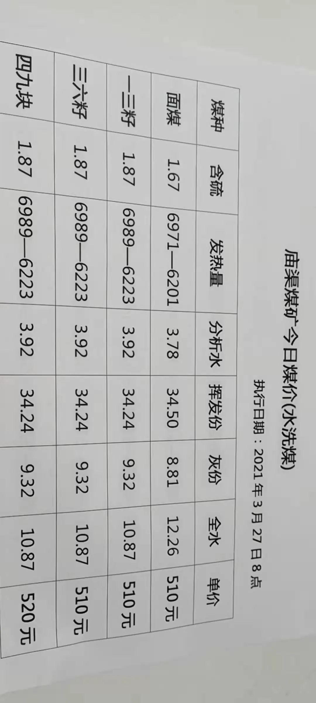 2021年3月28日早7點大砭窯煤礦:面煤漲80元,所有塊煤漲價40元。